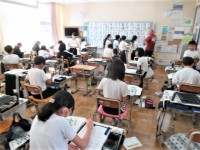 (写真上・中)六年生は国語で狂言をとりあげています。いつもと違う文体ですが、そのよさも感じてください。(下)図形の体積を求めるにも計算が正しくできることが必須です。