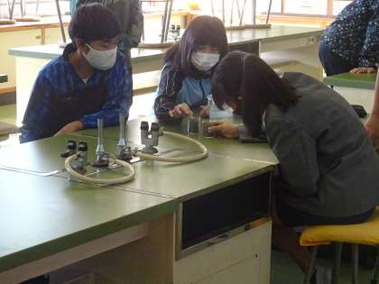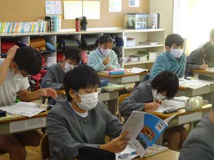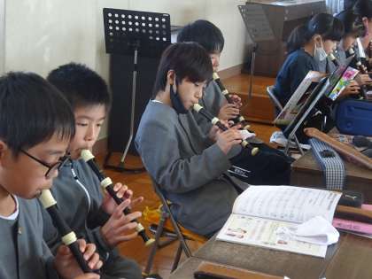 (写真上)地層がどのようにできるのか観察するようです。(中)時代は江戸です。六年生の社会科も着々と進んでいます。(下)リコーダーの演奏に集中していました。今日は実技テストもあるようです。