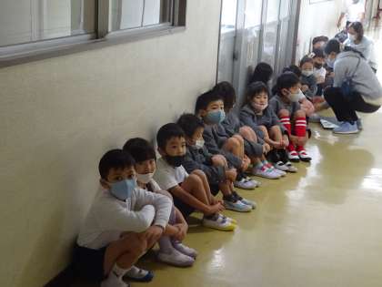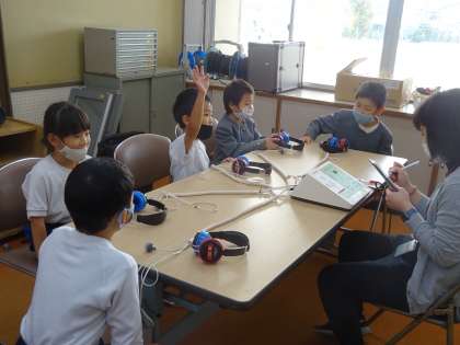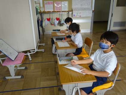 (写真上)学習メニューに沿って問題に取り組んでいます。(中・下)一年生は聴力検査を行いました。少し緊張気味です。