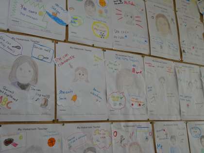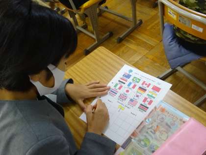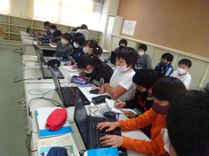 (写真上)英語ルームに担任の先生の紹介が掲示してありました。外国語の時間に学んだことが生きています。(中)ゲームをしながら、他国への興味関心を高めます。(下)六年生はインターネットを使って、情報を集めていました。