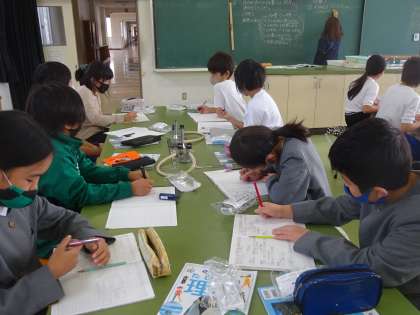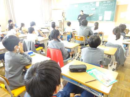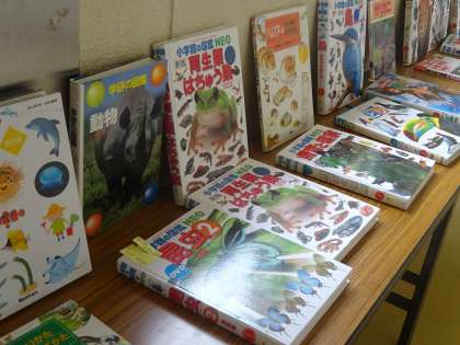 (写真上)図工では木版画が始まります。今日は導入のようです。(中)五年生の廊下に図鑑が並べてありました。何に使うのか興味が湧きます。(下)「ものが水に溶ける量に限界はあるのか?」を課題に実験を行います。