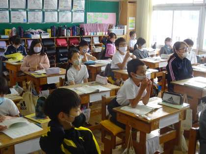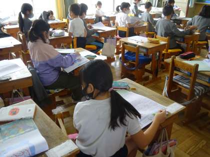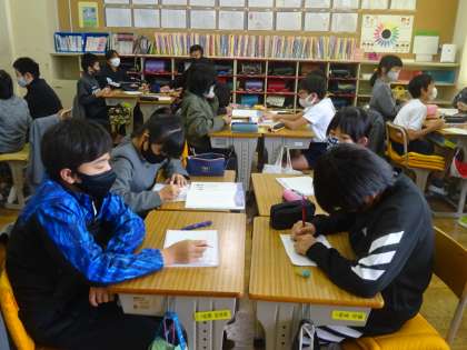 (写真上)友達と力を合わせて連詩に挑戦していました。(中)テストが戻ってきました。見直しをしてファイルに整理していました。(下)四年生の国語の授業です。お礼状で感謝の気持ちを伝えます。