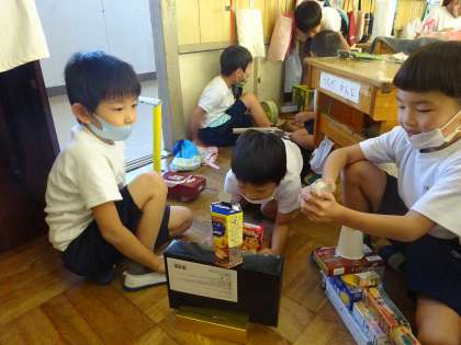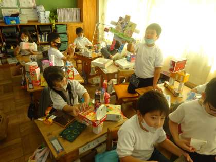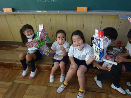 一年生は図工の時間でした。作品が完成したところで、喜んで見せてくれました。想像力のたくましさに脱帽です。