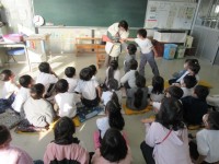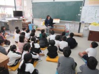 書写の授業で、書き初めをやりました。長い下敷きに長い練習用紙、いつもより太い筆を使って書くので、教室ではできず、生活科室で行いました。床に正座したり、紙にまたがったりしてゆっくり丁寧に取り組みました。
