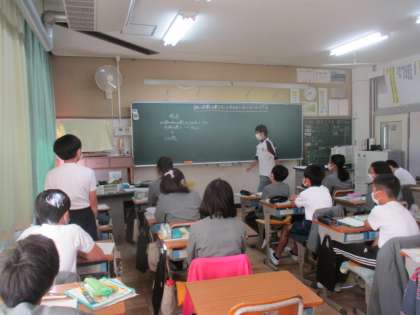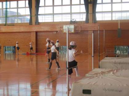 グループに分かれて、ゴムをリズムよく跳び越えるところから練習しています。