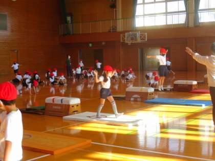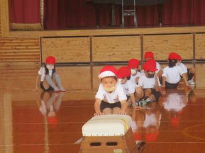カエル足のように跳び箱へ進み、跳び箱の上からジャンプして降りるようにします。