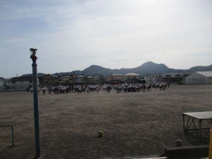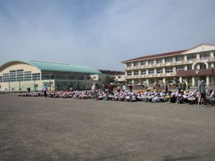 運動場で遊んでいた子供たちは運動場中央へ、校舎内にいた子供たちは、一次避難場所を考えて移動します。