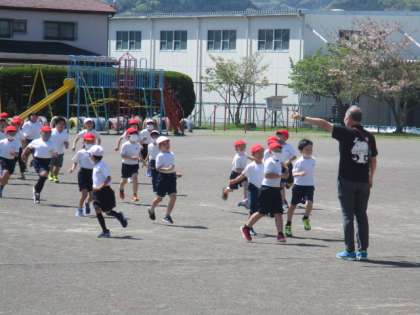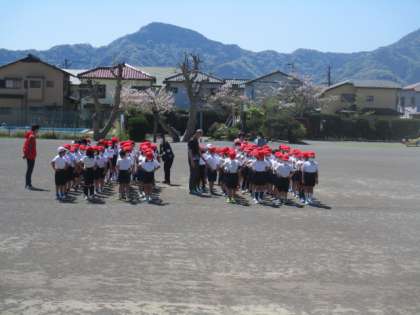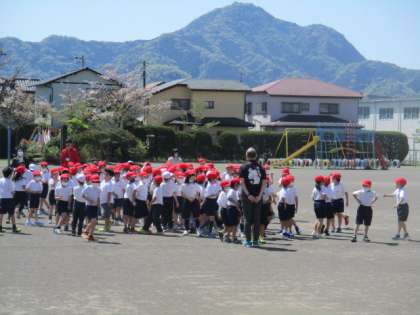2年生の体育の授業の様子です。学年で一斉に行っていました。最初の体育ということで、まずは並び方の練習をしていたようです。場所を移動してもしっかりと並べていて、立派でした。