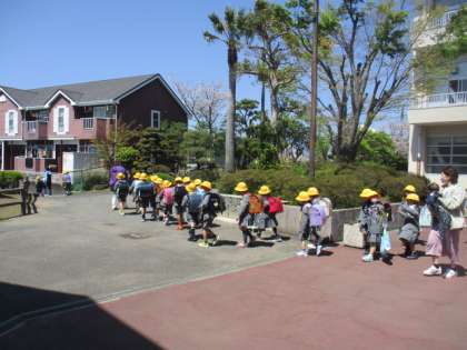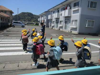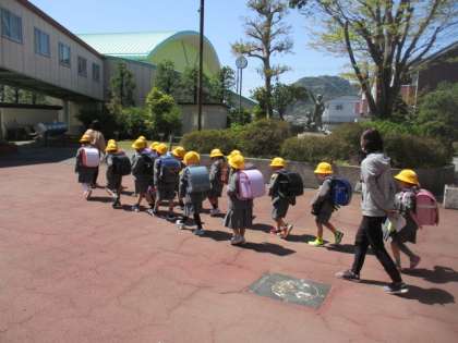 1年生の下校の様子です。下校する方面ごとにグループになり、引率の先生の指示に従って、下校していきました。しっかりと列になって、横に広がることもなく、間が空くこともなく、一生懸命歩いている姿がとっても素敵でした。