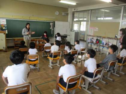 なかよし学級の1組、2組、3組の子供たち全員が、2組の教室に集まって一緒に学習をしていました。先生の話を聞く姿勢が立派ですね。