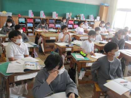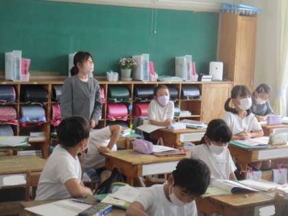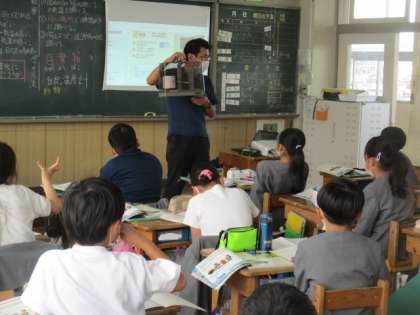 4年生の理科の授業の様子です。気温の変化について学習するところです。気温や湿度を記録する実物の機械を見て、驚いていました。