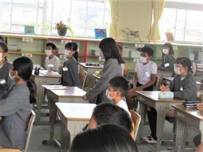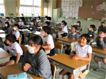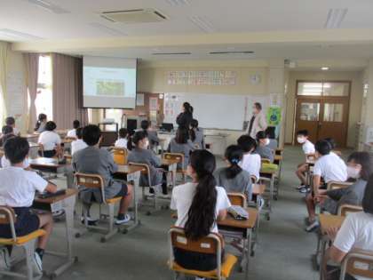 5年生の外国語の授業の様子です。今年初めての外国語の授業のようです。映像と英語で示されたいくつかのヒントから、どの先生のことを言っているのかを考えるクイズをやって、盛り上がっていました。