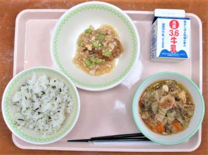 菜めしご飯、牛乳、揚げ出し豆腐、そぼろあん、すき焼き煮