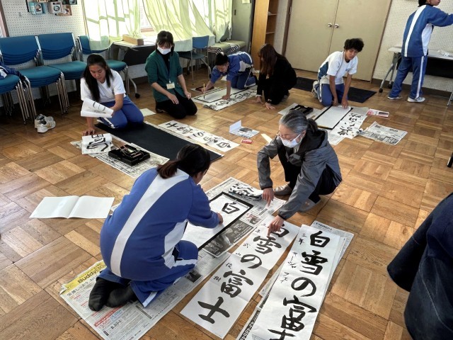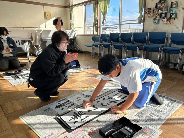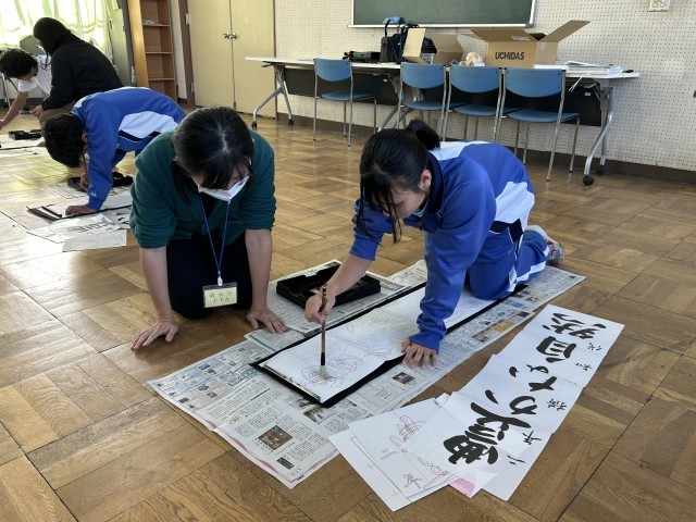 三者面談に合わせて、外国籍生徒の学習支援を行いウィンタースクールを実施しています。学校運営協議委員やPTAサポーターにお手伝いいただきながら、少し早い「書き初め」に取り組みました。初めての「書き初め」となった生徒もいましたが、教えてもらいながら丁寧に仕上げることができました。