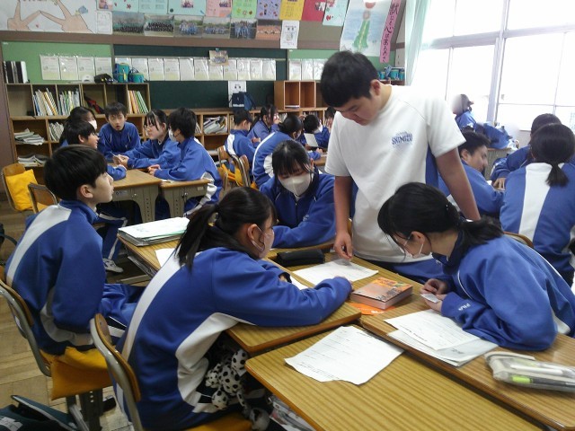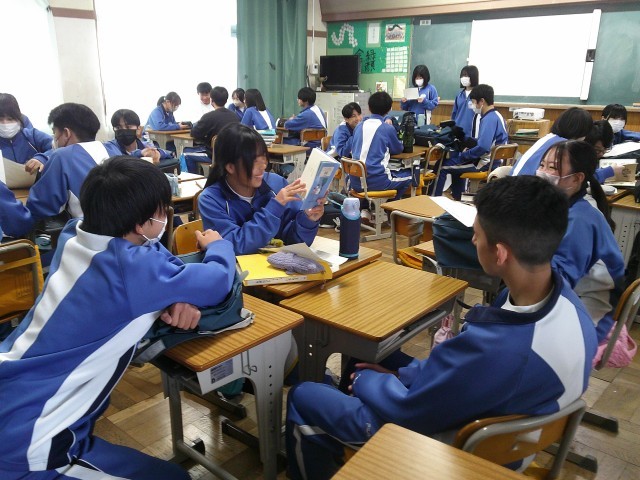 1年生と2年生はお互いに本を紹介しあう中で、紹介の仕方のうまさを競うビブリオバトルを行いました。今日は学級のグループ内での発表でした。生徒たちが笑顔で交流している様子が印象的でした。