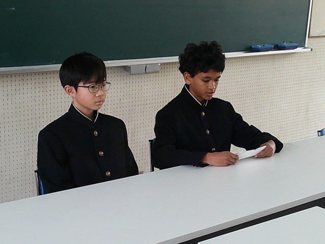 令和8年度の生徒会本部役員を決める生徒会役員選挙を3月4日に控え、候補者たちが一生懸命選挙活動にも熱が入ってきました。その一環として給食の時間にオンラインで候補者の応援演説を行っています。推薦責任者が候補者を推薦した理由を伝えてくれています。どの候補者も役員にふさわしい人物だということがわかります。