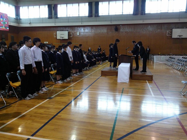 令和7年度の修了式を実施しました。生徒が体育館に集合してくる様子からも、この一年の成長を感じました。修了証書を授与されたことで、生徒全員である1年生175名、2年生182名が4月に進級します。新しい学年でどのように成長していくのか、とても楽しみです。