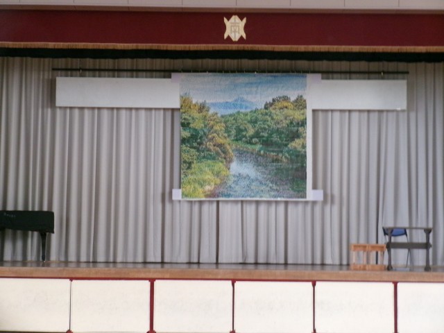 先日、清水町芸術祭に出品した5組のモザイクアートですが、現在は体育館ステージに展示されています。しばらく体育館に展示をする予定ですので、機会がありましたらご覧いただければと思います。