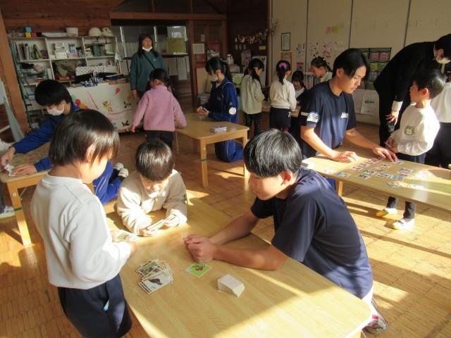 今日はかるた取りやこままわしなどのお正月の遊びやじゃんけん列車など室内遊びを中心に交流しました。
