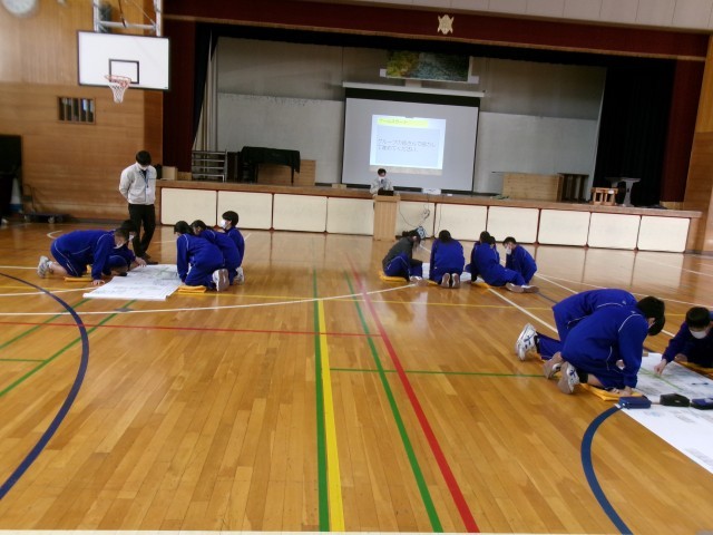 避難所には実際に災害にあった人、ペットを連れてくる人、日本語を話せない外国の人、お年寄り、妊婦さん、体調が悪い人、赤ちゃんなど様々な人がやってきます。その方たちにどこにどのように避難してもらうのが良いのか話合いをしながら場所を決めていきます。そんな中で、どんなところで炊き出しをするのか、救援物資をどこに置くのか、避難してきた人たちの要望にどこまで答えるのか…など様々な課題が出されます、1つ1つのことを一生懸命考えながらよりよい答えを導きだそうとしている生徒の様子が見られました。