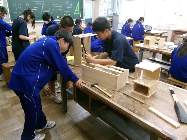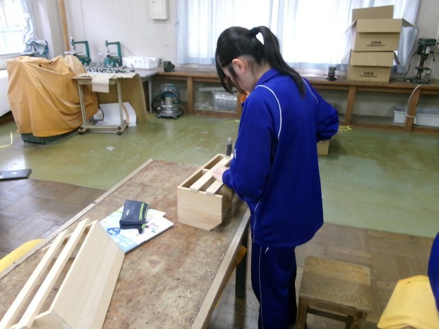 木材を使って、本棚や小物入れを制作しています。作業は仕上げの段階で、素敵な作品が完成しつつあります。